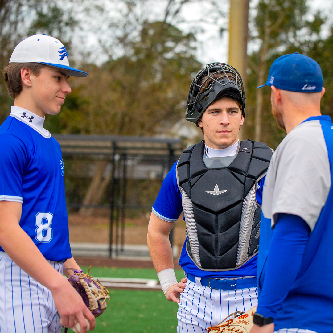 St. Andrew’s head baseball coach Stephen Vaughn talks with brothers Ellis Kelley (left) and Jack Kelley during a Lions game in Savannah. (Photo courtesy of the St. Andrew’s School Athletic Department)