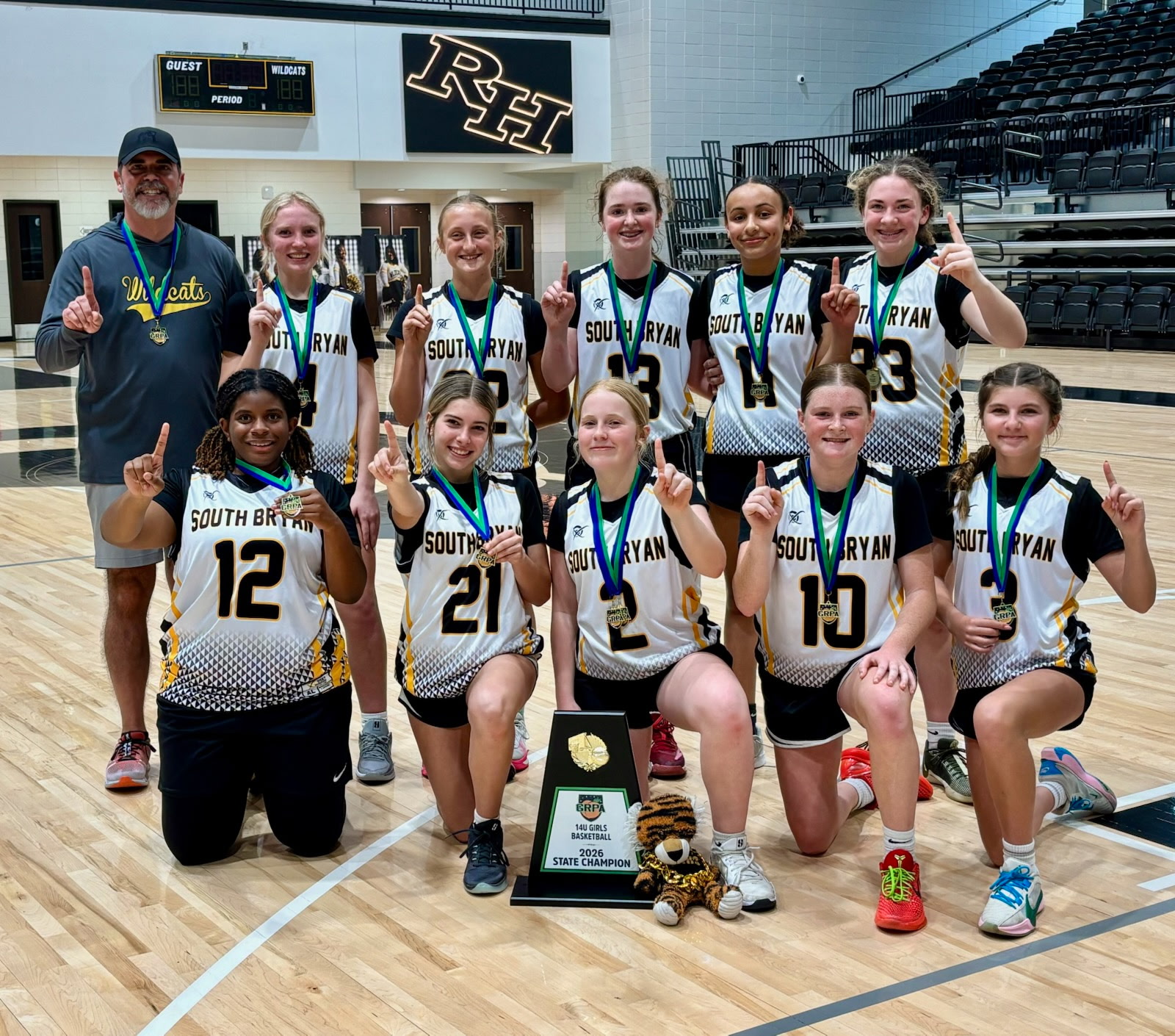 South Bryan County 2025 12U girls basketball team poses after winning the GRPA state championship. Back row, from left: co-coach Alex Tucker and co-coach Cory Sommers. (Courtesy of South Bryan County Basketball)