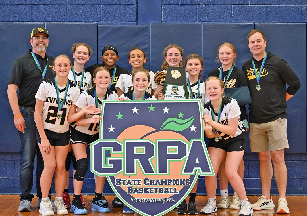 South Bryan County 14U girls basketball team poses after winning the GRPA state championship. Back row, from left: Co-Coach Alex Tucker, Lila Garren, Brooklyn Dunlevy, Georgia Tucker, Simone Pierre and Molly Miller. Front row, from left: Avoluwa “Ayo” Akerele, Stella Seagraves, Ansley Sommers, Makenzie Loth and Quinn Lock. Not pictured: Co-Coach Cory Sommers. (Courtesy of South Bryan County Basketball)