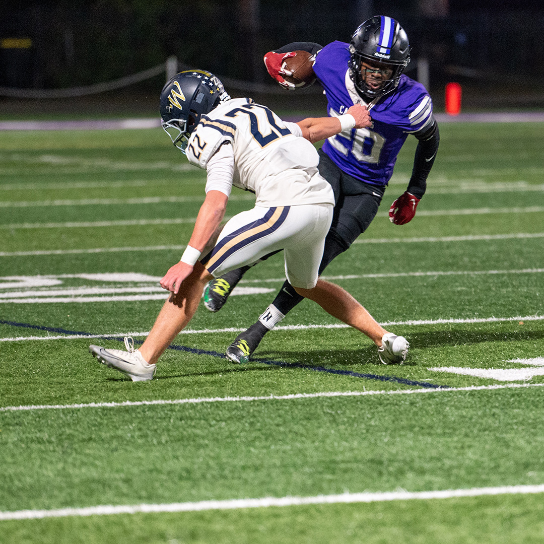 Savannah, Ga. — Calvary Day wide receiver Emerson Lewis (20) makes a sharp cut to elude a defender during Friday night’s GHSA quarterfinal against Whitefield Academy. Photo courtesy Prep Sports Report.