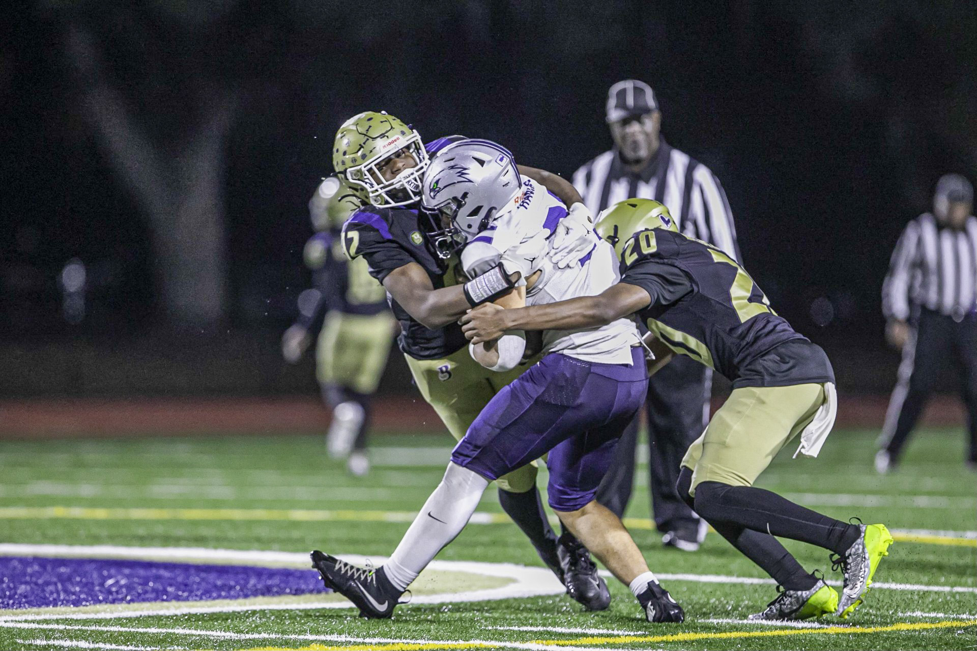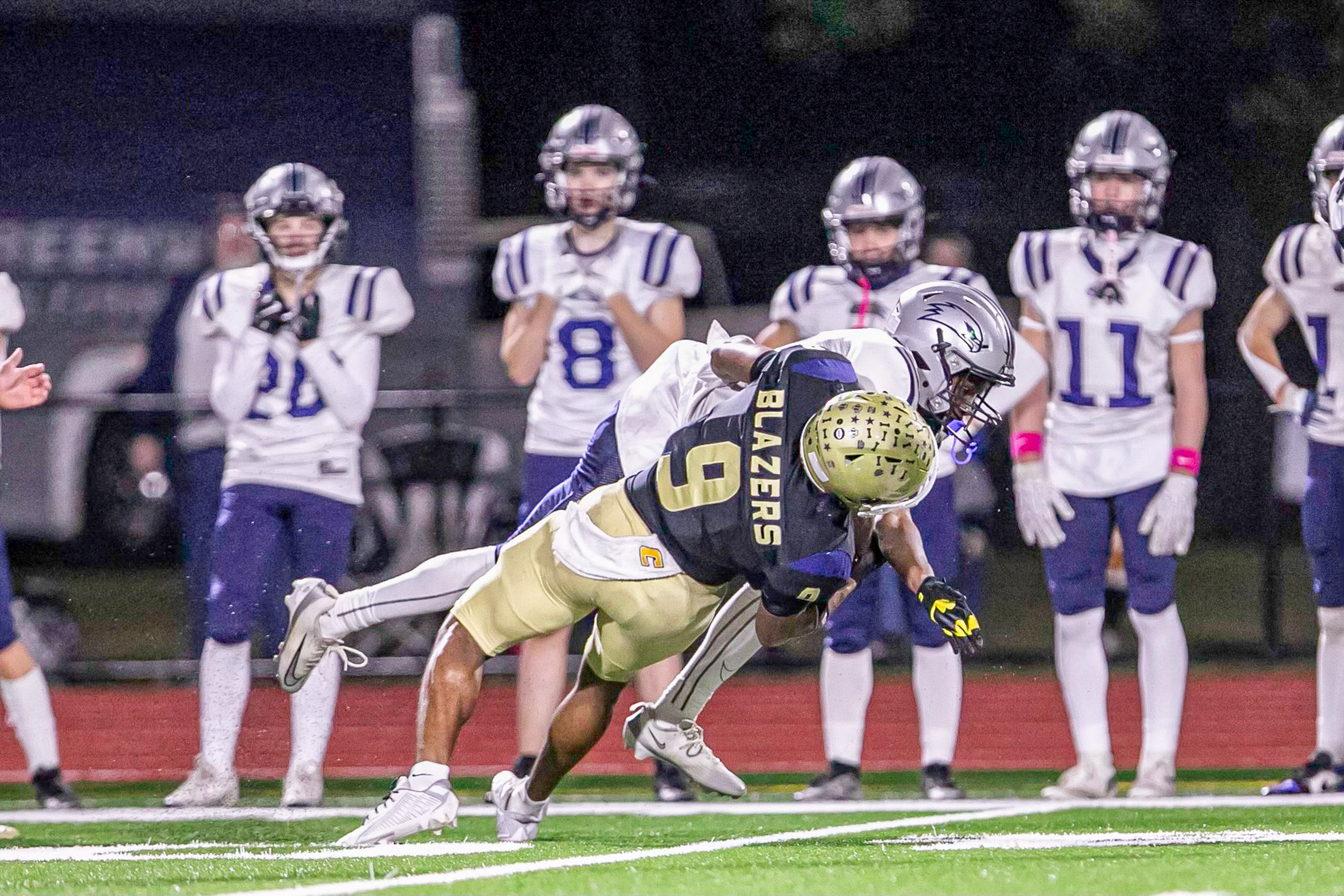 Bethesda defender Anthony Cook (20) helps finish off a tackle as the Blazers’ defense controlled the game early and set the tone with four turnovers.