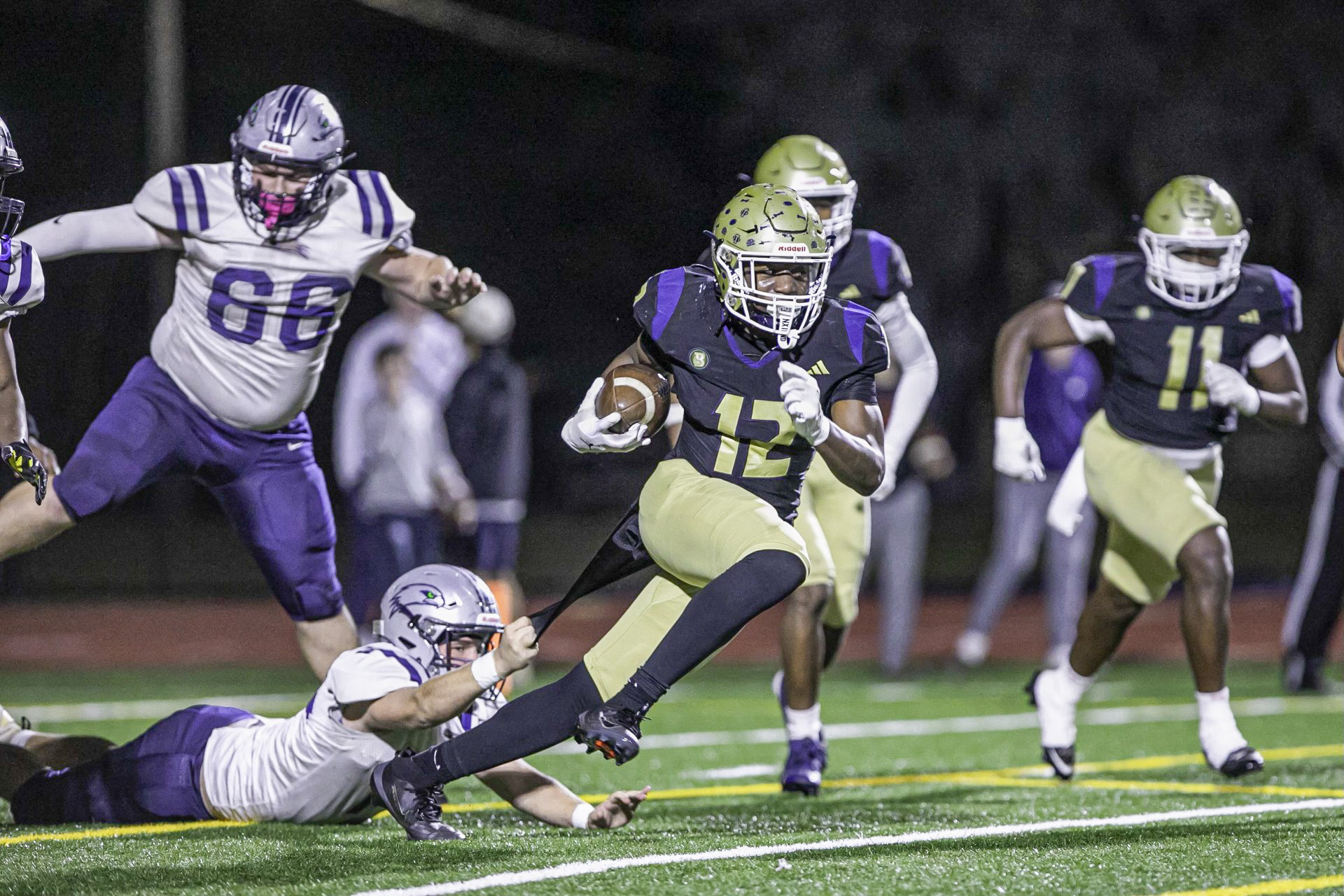 Bethesda defensive back Ka’Mond Young (12) breaks through a tackle after a turnover. Young added an interception and seven tackles in the semifinal victory. Courtesy RDP Productions/Kyunnie Shuman.