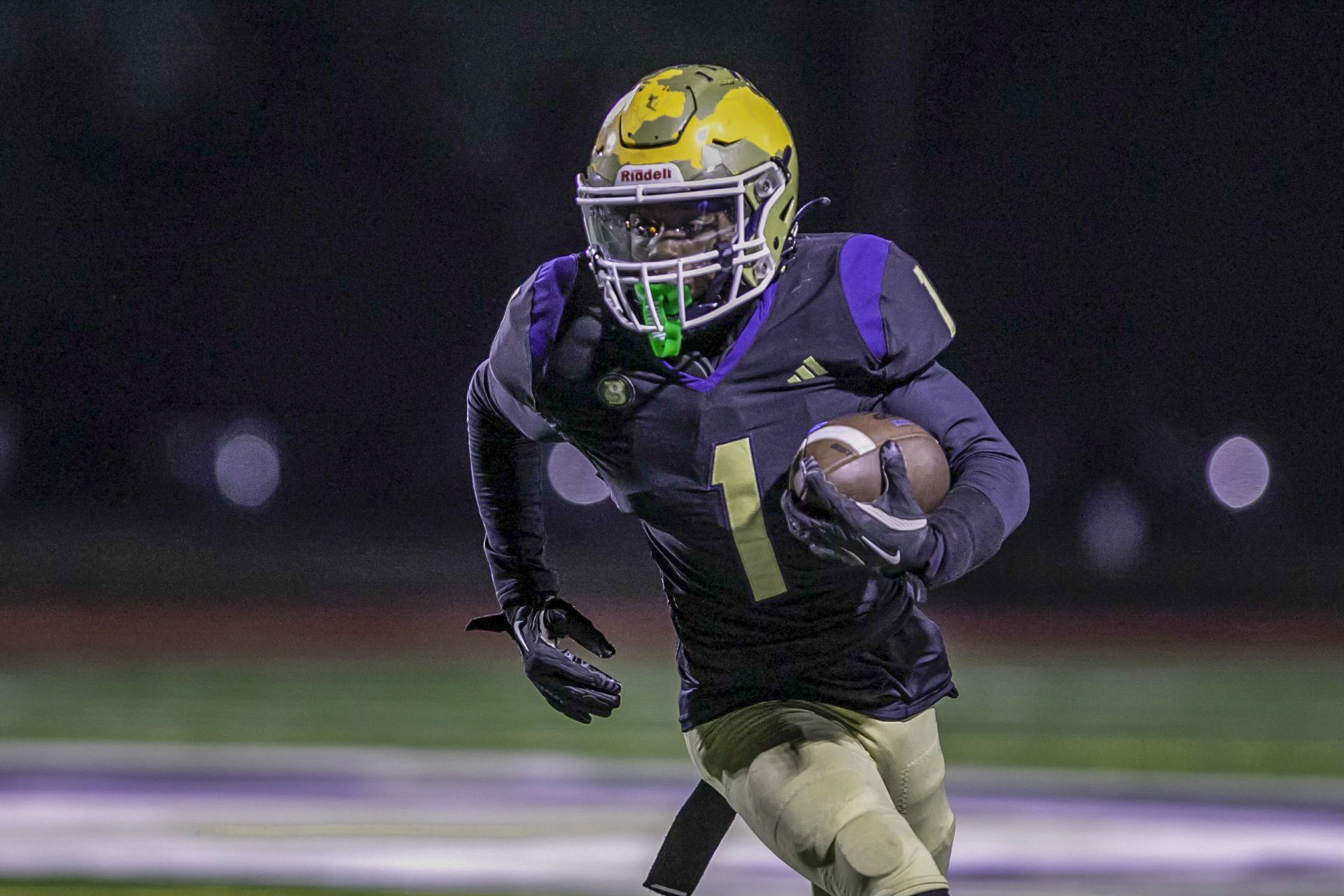 Bethesda cornerback Braylen Martin (1) sprints into the open field. Martin had two interceptions in the semifinal, helping a defense that forced four turnovers. Courtesy RDP Productions/Kyunnie Shuman.