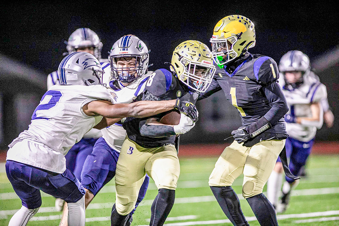 Bethesda running back Jeffrey Armstrong (8) powers through multiple Greenwood defenders during Friday’s semifinal victory. Courtesy RDP Productions/Kyunnie Shuman.