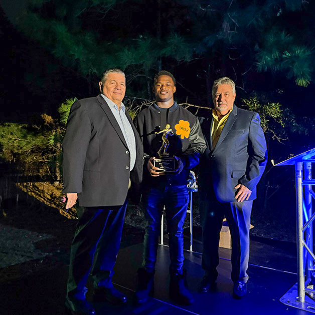 Benedictine senior Chris “Bubba” Frazier (center) holds the Michael Finocchiaro Memorial Outstanding Football Player Award after being honored during his send-off celebration. Frazier was presented the award by Mike Finocchiaro (left) and award coordinator Karl DeMasi. (Courtesy: Zach Fox / WTOC Sports Director)