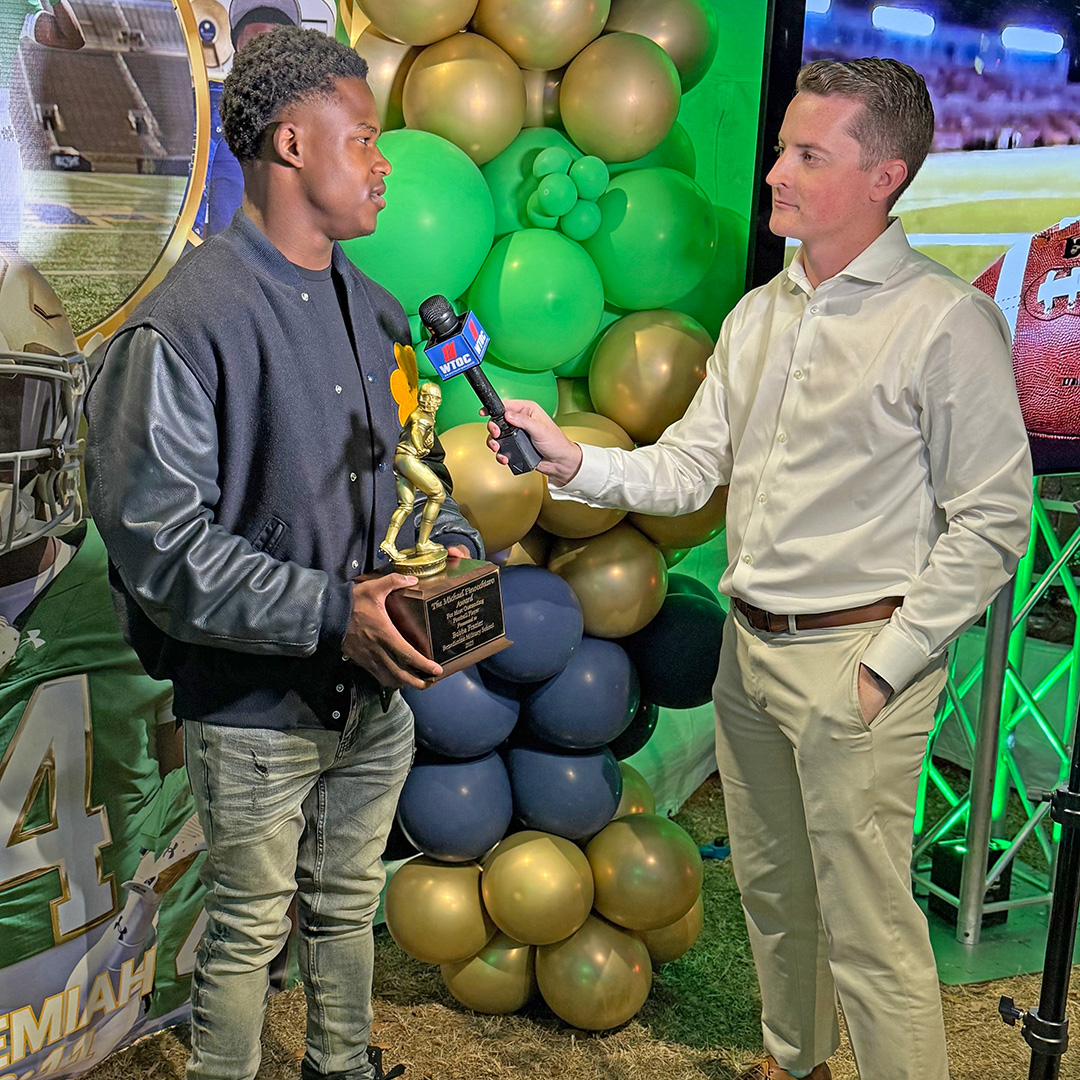 Benedictine senior Chris “Bubba” Frazier holds the Michael Finocchiaro Memorial Outstanding Football Player Award while being interviewed by WTOC sports director Zach Fox during Frazier’s send-off celebration in Savannah.