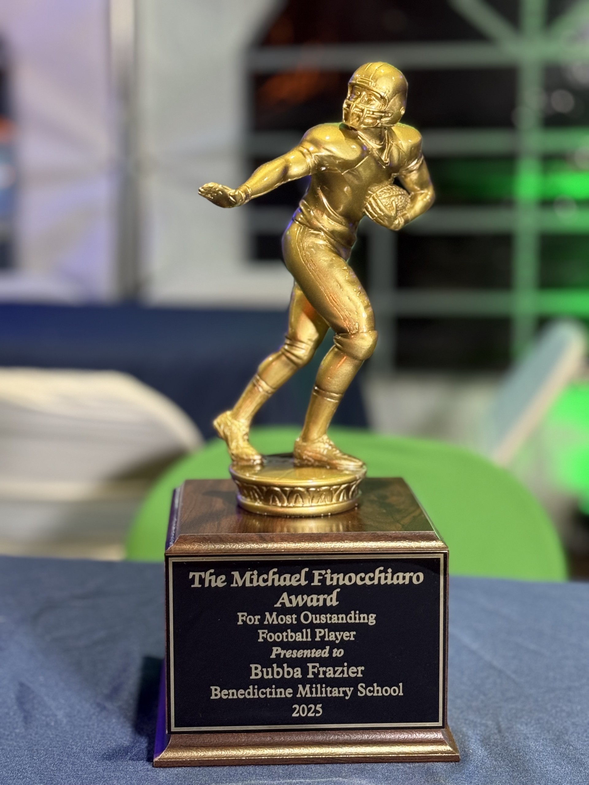 The 45th Michael Finocchiaro Memorial Outstanding Football Player Award trophy sits on display during the presentation honoring Benedictine senior Chris “Bubba” Frazier as Savannah–Chatham County’s top high school football player. (Trophy courtesy of Thompson’s Sports Shop.)
