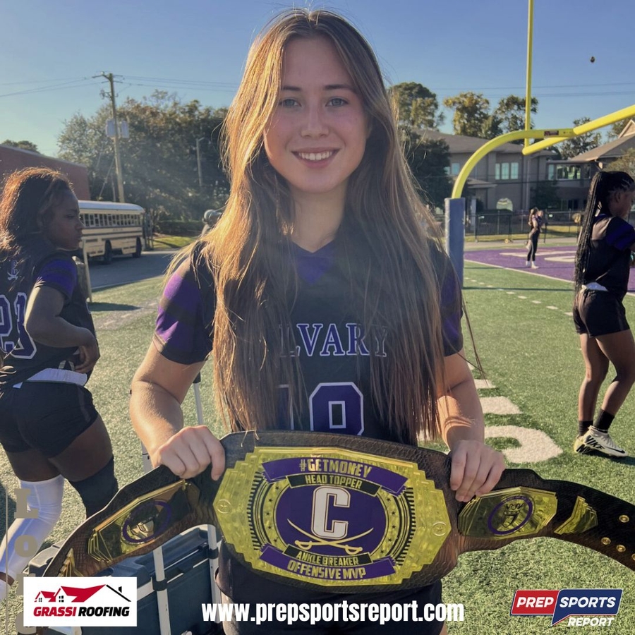 In two games last week on October 23, facing Claxton and Savannah Christian, the junior QB/safety threw for 402 yards and 4 touchdowns. She also ran for one touchdown and grabbed three interceptions on defense. That two-way performance earns her the Grassi Roofing Prep Sports Report Flag Football Player of the Week honor.