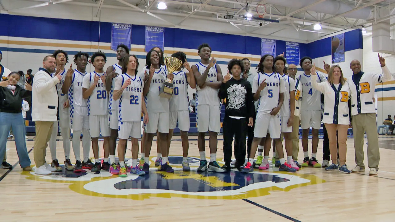 Bradwell Institute players celebrate with the region championship trophy after a 65-36 victory over Evans in the GHSA Class 5A boys championship game. (Photo courtesy WSAV)