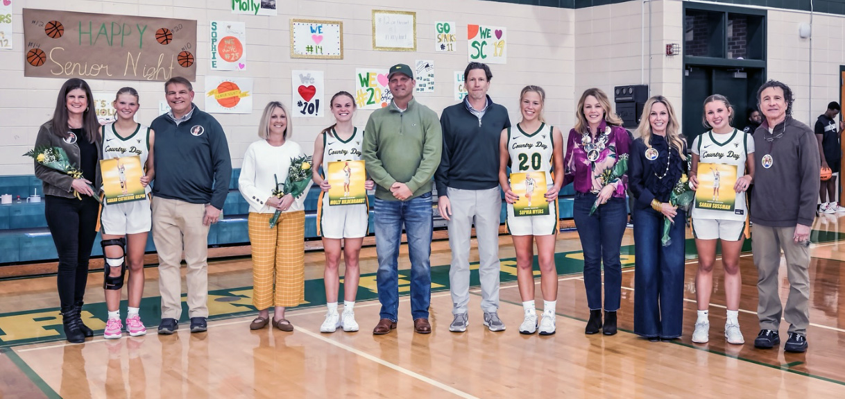 Savannah Country Day seniors Sarah Catherine Gilpin, Molly Hildebrandt, Sophie Myers and Sarah Sussman pose with their parents during Senior Night ceremonies at Savannah Country Day School. (Photo courtesy of Savannah Country Day School Athletics)