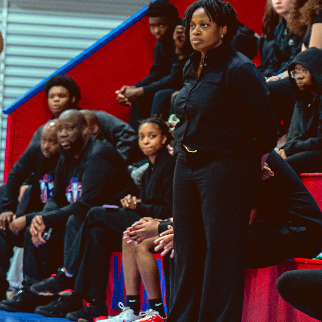Memorial Day School girls basketball coach Emon Grayson watches the action from the sideline during a game this season. Grayson led the Matadors to the GIAA Class A state tournament despite having just six available players. (Courtesy Ishootvibez)