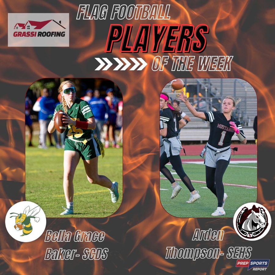 Savannah Country Day sophomore Bella Grace Baker and South Effingham senior Arden Thompson have been named Grassi Roofing Flag Football Players of the Week after standout performances at quarterback.