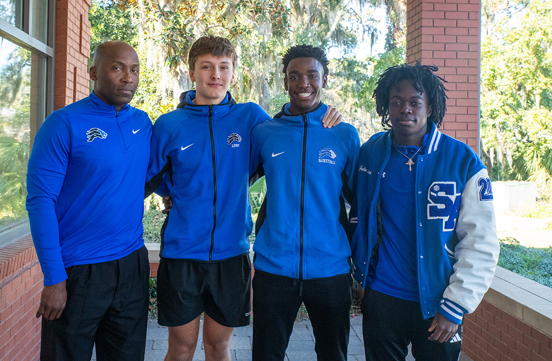 Photo (l-r): St. Andrew's School boys basketball coach Mel Abrams, senior Will Thompson, junior Zayden Edwards, senior Jaylen Sheppard.