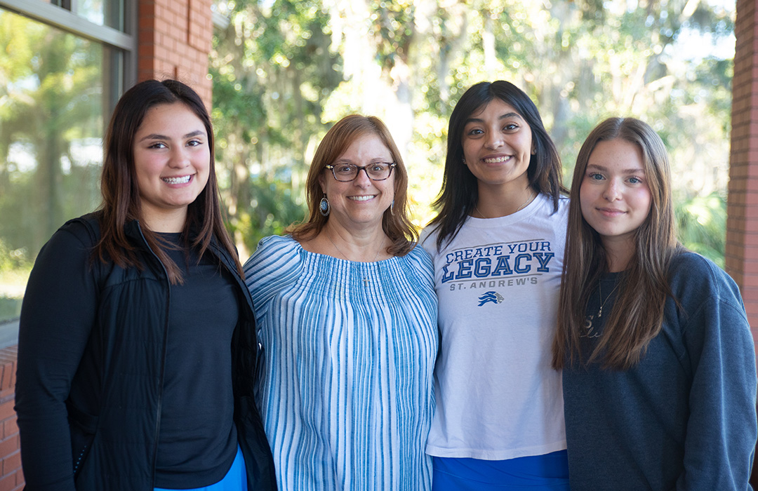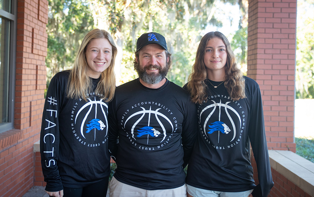 Photo (l-r): From left, senior Claire Fleming, St. Andrew's School girls basketball coach Jimmy Stettler, sophomore Coco Carnahan.