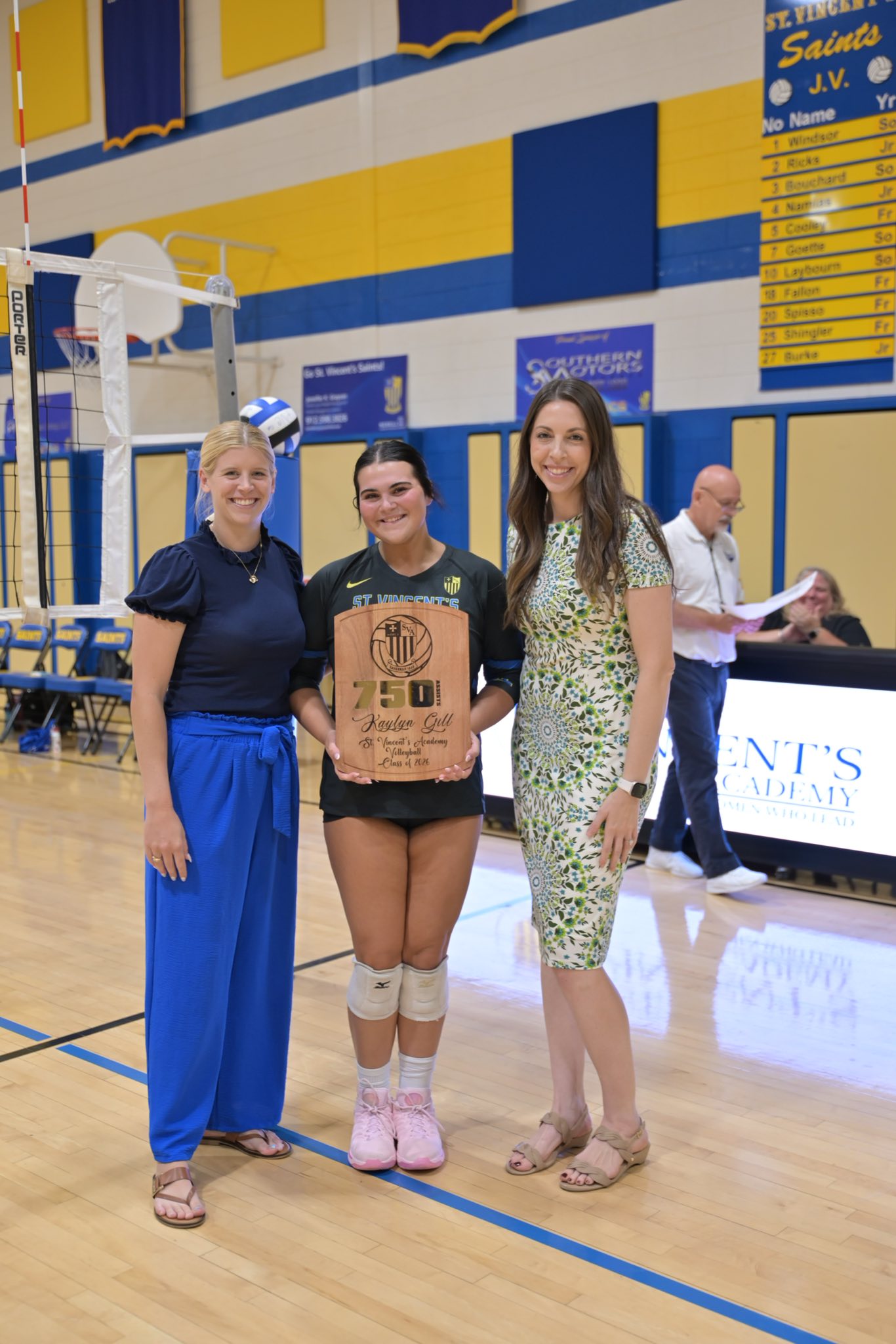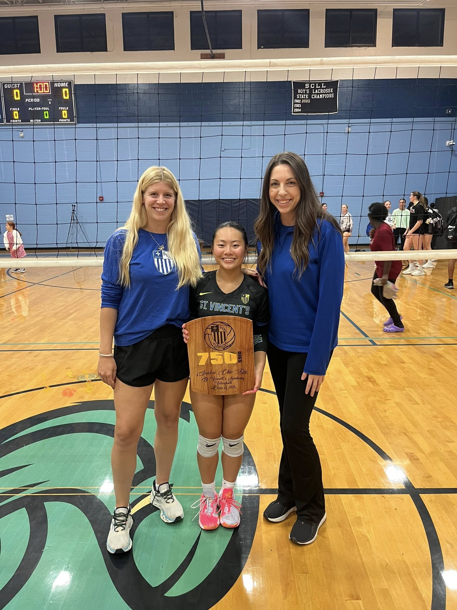 St. Vincent’s Academy senior libero Sophie Chu-Dy is joined by Head Coach Sarah Stewart (left) and Assistant Coach Leia Dedic after recording her 750th career dig milestone on October 3. (Courtesy St. Vincent's Academy)