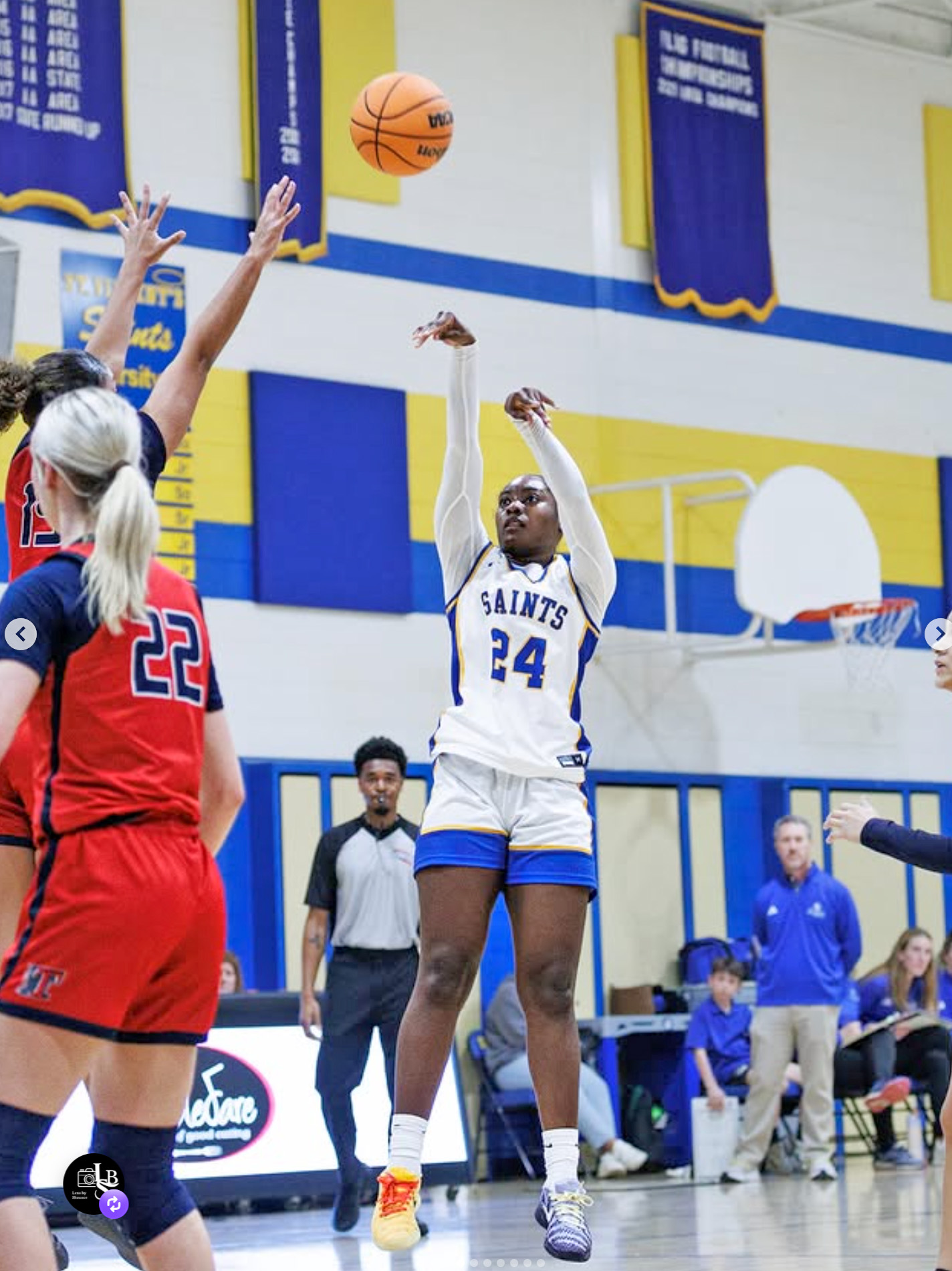 Anna Thomas-Hines #24 in white of St. Vincent’s Academy goes up for a shot against Toombs County during a girls basketball game. (Photo courtesy of lensbyshaunce_)