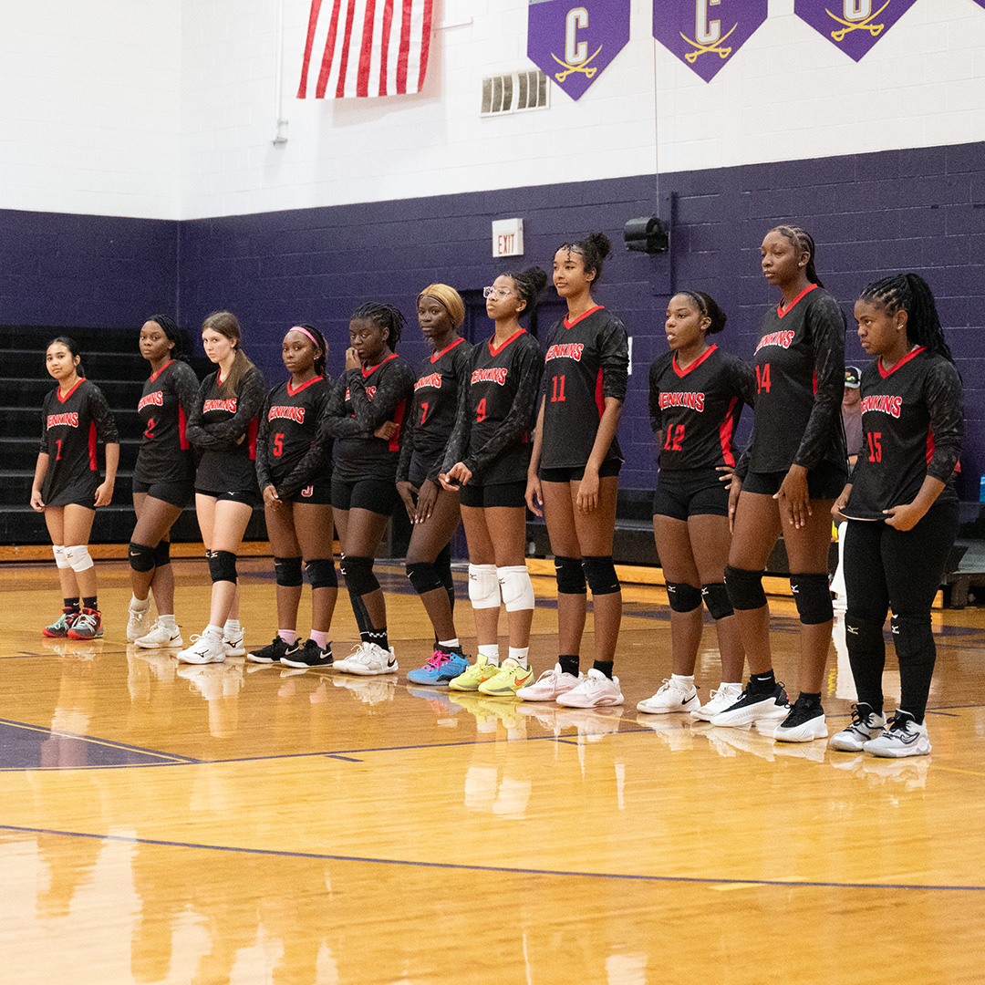 H.V. Jenkins High School volleyball team stands together before their GHSA Class 3A, Region 3 semifinal match on October 4, 2025, at Calvary Day School.